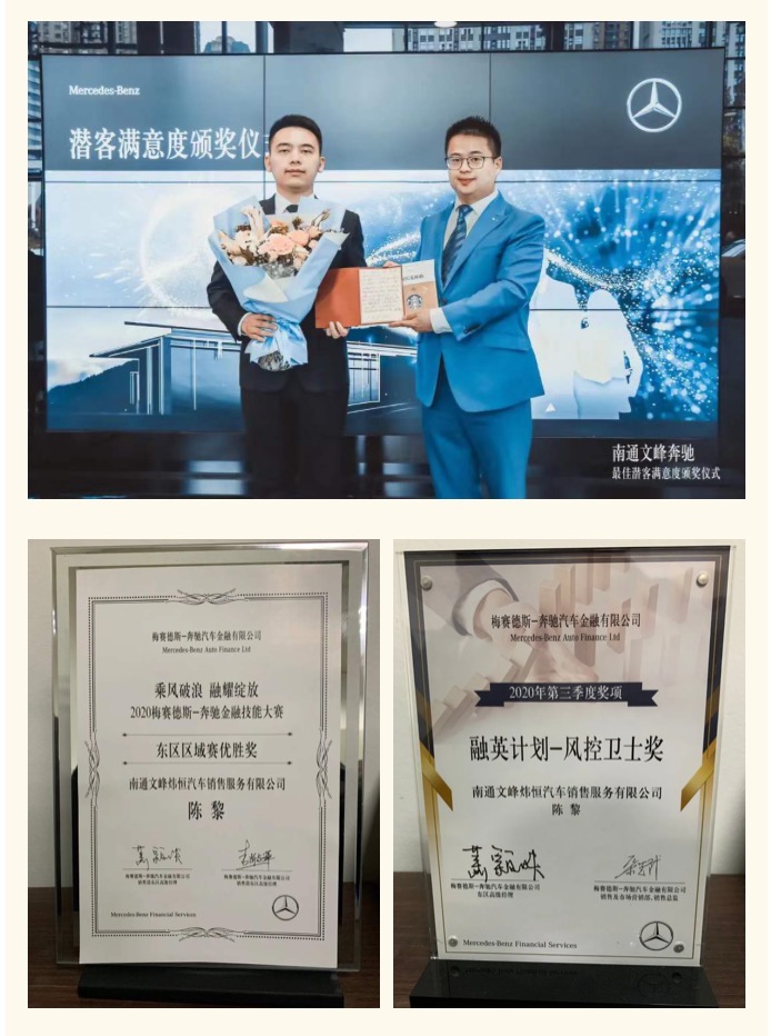 ▲ 南通文峰奔馳銷售部在“梅賽德斯-奔馳全國(guó)潛客滿意度”評(píng)選中取得優(yōu)異成績(jī),金融部在梅賽德斯-奔馳東區(qū)金融技能大賽斬獲“東區(qū)區(qū)域賽優(yōu)勝獎(jiǎng)”和“融英計(jì)劃-風(fēng)控衛(wèi)士獎(jiǎng)”