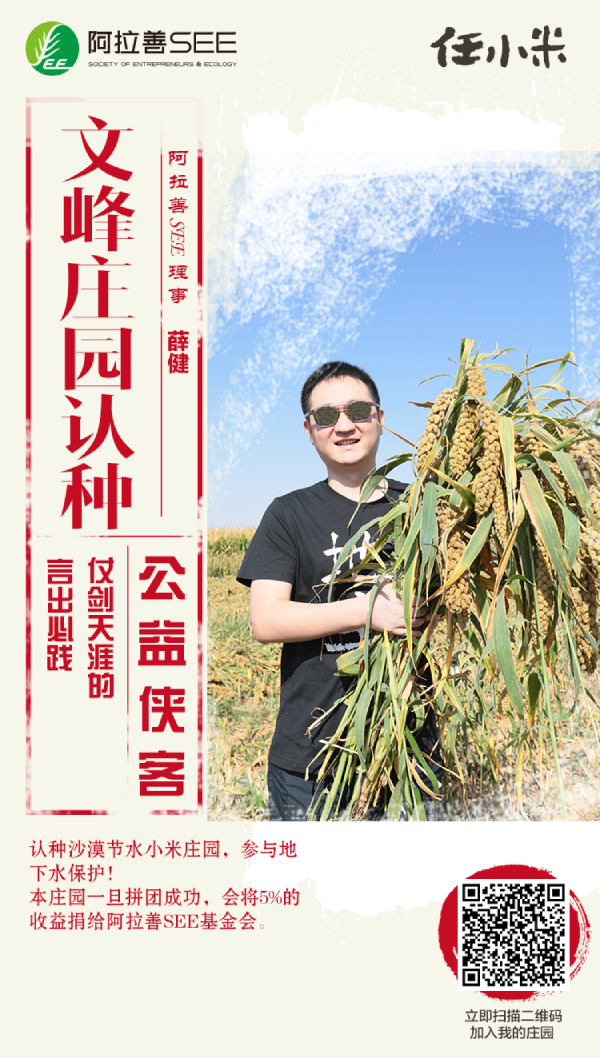 阿拉善,蒙語意為“五彩斑斕之地”,由于干旱少雨,荒漠化治理任重道遠。為控制阿拉善地區沙漠蔓延,保護地下水資源,阿拉善SEE生態協會與內蒙古阿拉善左旗政府合作,共同推動節水小米的種植,這種沙漠小米被稱為“任小米”。